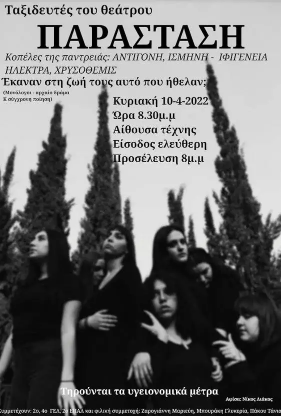 Την Κυριακή 10 Απριλίου οι «Ταξιδευτές του θεάτρου» και η υπεύθυνη της ομάδας κυρία Γκουτζιαμάνη Γιάννα παρουσίασαν στην Αίθουσα Τέχνης την παράσταση «Κοπέλες της παντρειάς: Αντιγόνη, Ισμήνη, Ιφιγένεια, Ηλέκτρα, Χρυσόθεμις – Έκαναν στη ζωή τους αυτό που ήθελαν;», που περιλάμβανε μονολόγους από το αρχαίο δράμα και από τη σύγχρονη ποίηση.