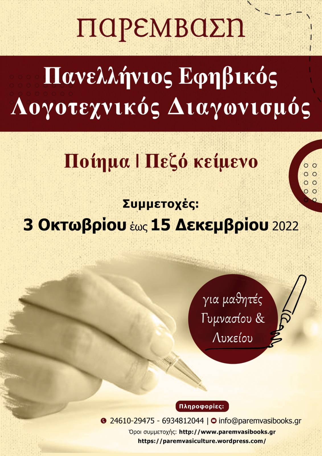 Τα ποιήματα και τα διηγήματα θα γίνονται δεκτά μόνο σε ηλεκτρονική μορφή και θα αποστέλλονται στη διεύθυνση: info@paremvasibooks.gr Στο e-mail θα υπάρχει επισύναψη του κειμένου σε μορφή word.doc ή docx, αλλά όχι σε pdf. Είναι απαραίτητο να δηλώνεται ο τίτλος του ποιήματος ή του διηγήματος, καθώς και όλα τα στοιχεία ταυτότητας και επικοινωνίας κάθε συμμετέχοντος: Ονοματεπώνυμο, διεύθυνση και τηλέφωνο επικοινωνίας. Ο τίτλος του E-mail θα είναι: ΛΟΓΟΤΕΧΝΙΚΟΣ ΔΙΑΓΩΝΙΣΜΟΣ ΓΙΑ ΕΦΗΒΟΥΣ.